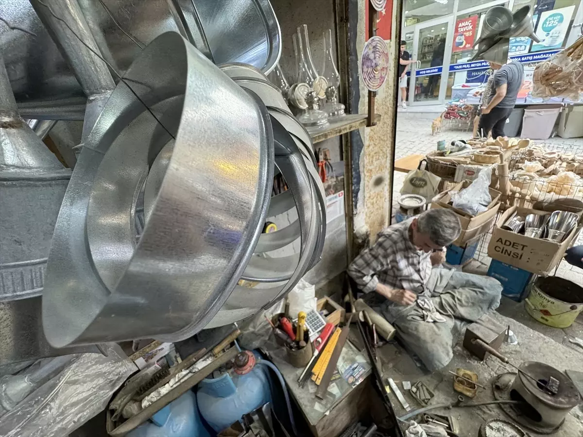 Hatay’da babasının 8 metrekarelik atölyesinde saca şekil vermeyi öğrenen Mustafa Gürler, tenekecilik mesleğini 70 yıldır aynı yerde yaşatıyor.