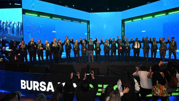 Lansman toplantısının finalinde Başkan Alinur Aktaş, 17 ilçenin belediye başkan adayları, Ak Parti, MHP ve BBP İl Başkanlarını kürsüye davet ederek birlik beraberlik fotoğrafı verdi. – BURSA